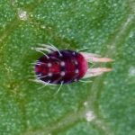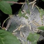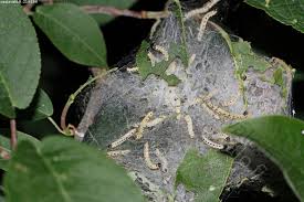 Nakon kretanja vegetacije, gusenice najpre izgrizaju pupoljke, pa miniraju listove. Kada porastu, gusenice se hrane epidermisom, a na kraju se hrane celom površinom lista. Listovi na kojima se hrane su uvezani svilom – prave zapretke, obično na vršnim delovima grana. Kada obrste listove u zapretku, sele se i prave novi zapredak. Gusenice su sivkastožute, a na leđima imaju dva reda crnih tačaka iz kojih rastu čekinje. Glava i vratni štit su crne boje.